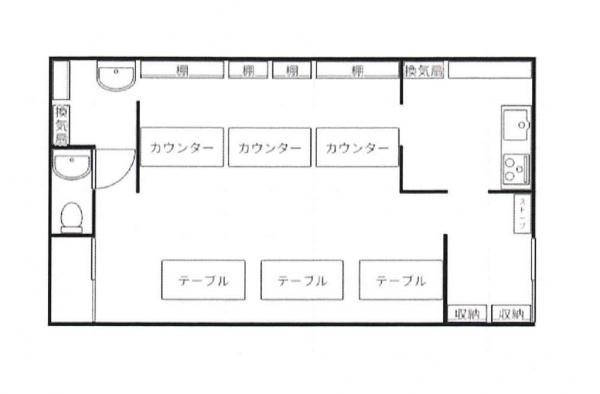 | 備考 | 設備:トイレ・シンク・照明・イス・テーブル・収納棚・カウンター・冷蔵庫・入口網戸 貸出可能:製氷機・寸胴・ガス炊飯器・フライヤー・ミキサー・食器洗浄機・食器等 ・ゴミ収集代:4,400円 ・鍵交換:15,000円 ・家賃保証必須、火災保険必須 ・現状融資の引き渡しです ・解約予告3ヶ月前、短期解約違約金有り(3年以内2ヶ月分) |